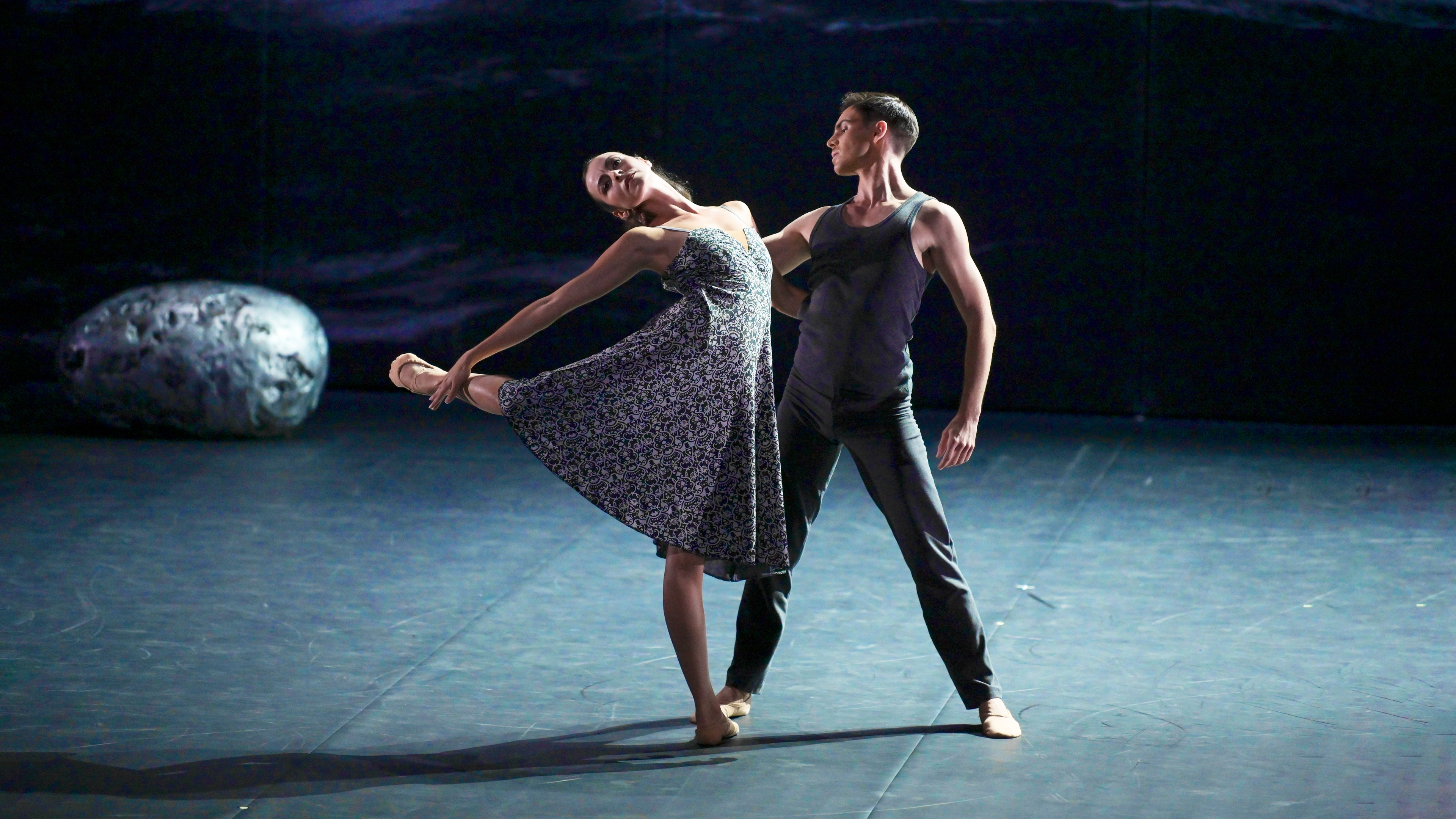 Dancers surge and collapse across seven stark tableaux. Cain lifts a silver stone above Abel. Orpheus guides Eurydice toward a golden threshold, her eyes closed. Couples advance, bound by touch alone. Love is rehearsed again and again, as if repetition might outwit fate.